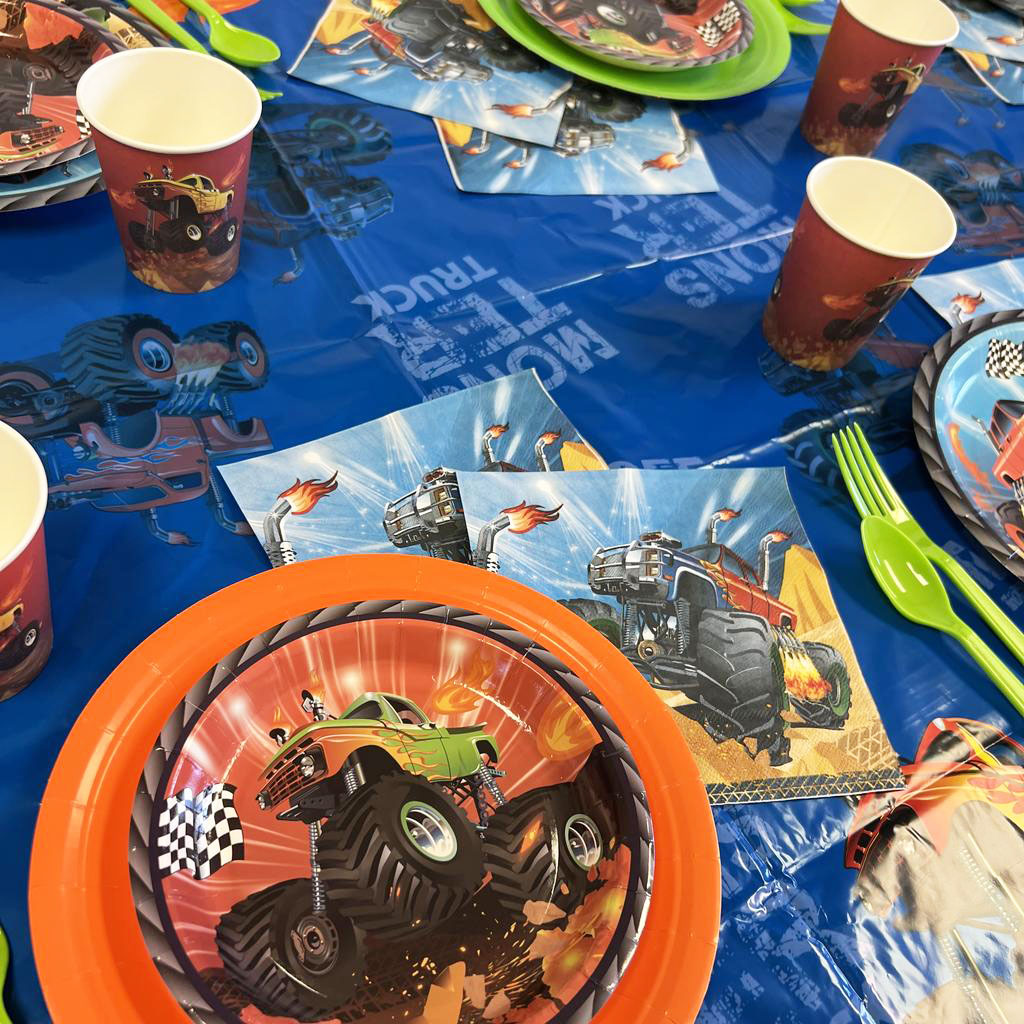 Get ready to crush the competition and fuel the fun with our Monster Trucks Plastic Table Cover from Party Direct! Featuring roaring monster trucks, flaming wheels, checkered flag borders, and bold trophy graphics, this table cover brings the thrill of the arena straight to your party space. The dynamic design is set against a vibrant blue background, making it the perfect centerpiece for any monster truck–themed celebration.