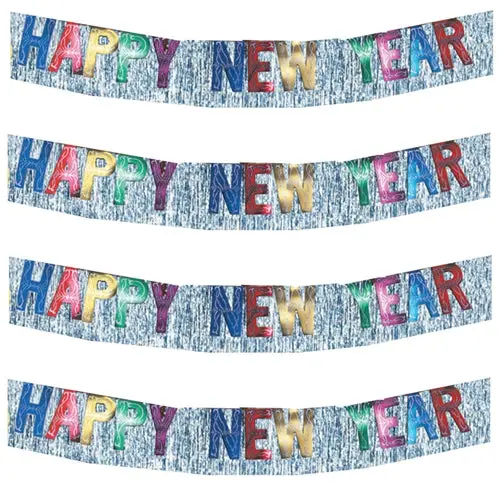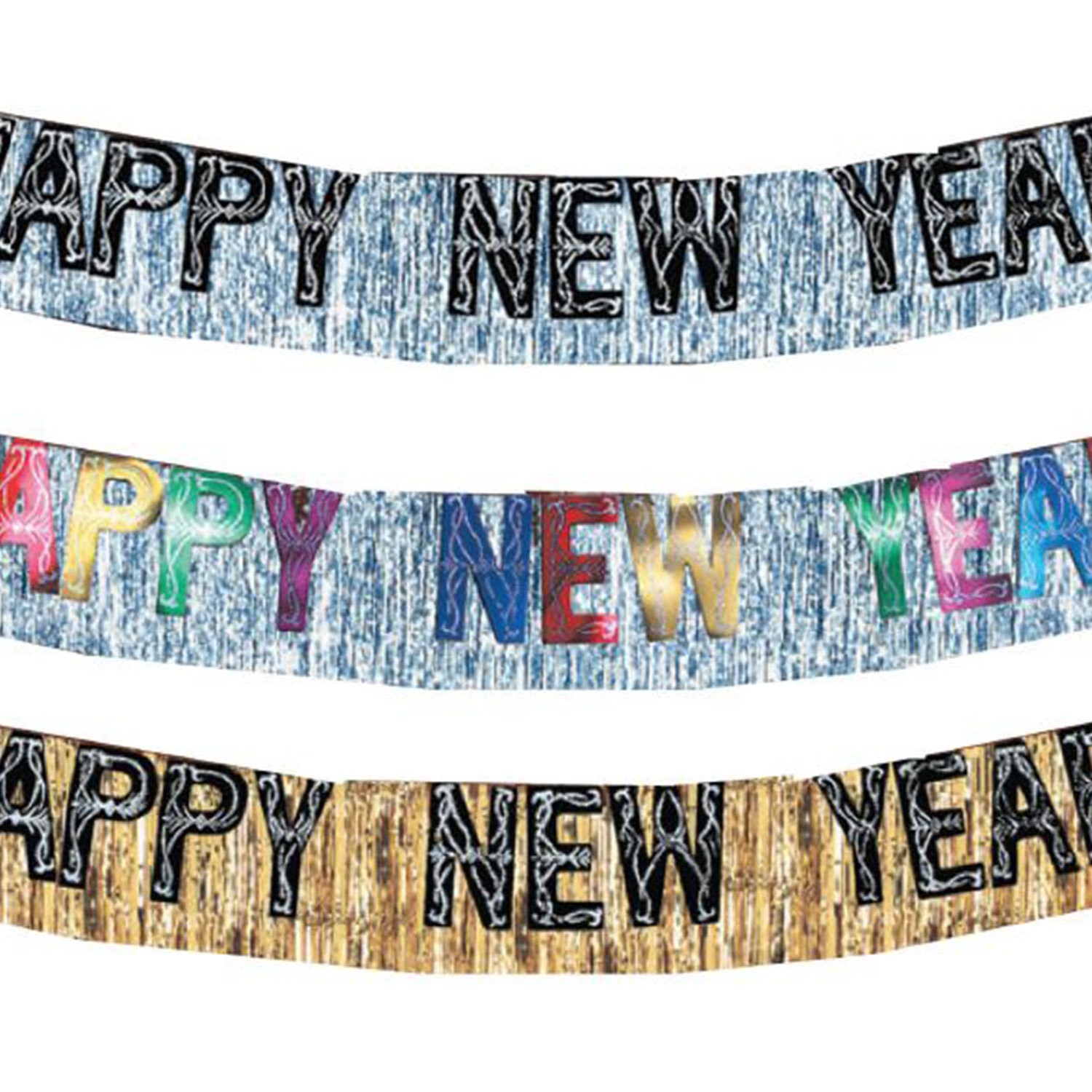 Happy New Year Foil Fringe Banner, Assorted, Black & Silver or Black & Gold - 1 Banner quantity
