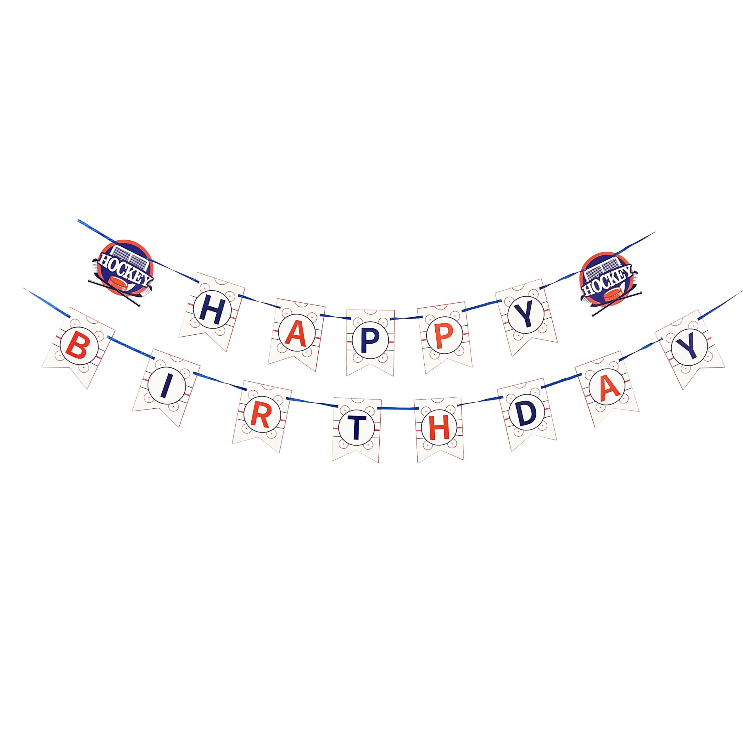 Score big at your celebration with the Hockey Happy Birthday Double Banner from Party Direct! Perfect for any hockey enthusiast’s birthday, this bold and festive decoration sets the stage for an unforgettable party. Featuring two rows of pennant-style flags with “HAPPY” on the top row and “BIRTHDAY” on the bottom, each letter is designed in striking red and blue with hockey rink–inspired details that capture the excitement of the game.
